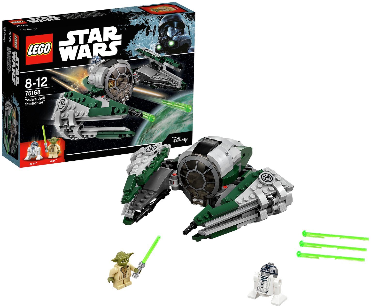 Jedi Master Yoda's Starfighter is just the thing for traveling to distant planets. Place Yoda in the cockpit and load up R2-D2. Then fold the wings, load the shooters and get ready to launch into action!